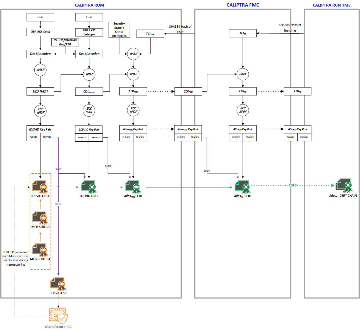Caliptra defines a design standard for a Silicon internal RoT baseline. This standard satisfies a Root of Trust for Measurement (RTM) role. The open-source implementation of Caliptra drives transparency into the RTM and measurement mechanism that anchor hardware attestation. The SoC must measure the code and configuration it boots into Caliptra. Caliptra must store these measurements and report them with signed attestations rooted in unique per-asset cryptographic entropy. As such, Caliptra serves as a Root of Trust for Identity (RTI) for the SoC.