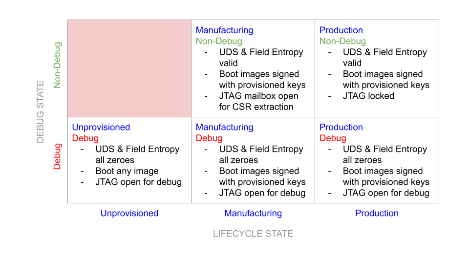 As an extension to controlling configuration, the Silicon RoT must control the security states (for more information, see Caliptra Security States). Certain security states by design grant full invasive capabilities to an external operator, for debug or field analysis.