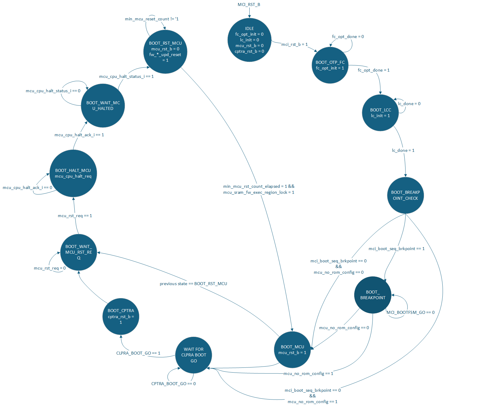 #![allow(unused)] fn main() { /// Boot configuration flags passed to initiate_boot #[derive(Debug, Clone, Copy, Default)] pub struct BootFlags { /// When true, streamed image chunks are also dual-written to staging memory pub flash_writeback: bool, /// Controls when staging memory is committed to active flash partition pub flash_commit_policy: FlashCommitPolicy, } /// Defines when staging memory is committed to the active flash partition (vendor policy) #[derive(Debug, Clone, Copy, Default)] pub enum FlashCommitPolicy { /// Commit after all images are cryptographically verified/authorized (recommended) #[default] PostAuthorization = 0, /// Commit after the platform signals full boot success PostBootSuccess = 1, } /// Generic boot source provider interface for the MCU ROM /// This interface abstracts different boot sources (network, flash, etc.) pub trait BootSourceProvider { type Error; /// Initialize the boot source /// This performs source-specific initialization (e.g., DHCP for network, etc.) /// `flags` controls optional behaviors like flash write-back fn initiate_boot(&mut self, flags: BootFlags) -> Result<BootSourceStatus, Self::Error>; /// Get information about a firmware image fn get_image_metadata(&self, firmware_id: FirmwareId) -> Result<ImageInfo, Self::Error>; /// Download firmware image by ID /// Returns a stream for reading image data in chunks fn download_image(&mut self, firmware_id: FirmwareId) -> Result<ImageStream, Self::Error>; /// Get boot source status and capabilities fn get_boot_source_status(&self) -> Result<BootSourceStatus, Self::Error>; /// Deinitialize the boot source fn finalize(&self) -> Result<BootSourceStatus, Self::Error>; } /// Firmware ID enumeration #[derive(Debug, Clone, Copy)] pub enum FirmwareId { /// Caliptra FMC+RT image CaliptraFmcRt = 0, /// SoC Manifest SocManifest = 1, /// MCU RT image McuRt = 2, /// SoC Image (raw u32 value in range 0x10000000 - 0x1FFFFFFF) SocImage(u32), } /// Boot source initialization and capability status #[derive(Debug)] pub struct BootSourceStatus { pub ready: bool, pub initialized: bool, pub config_available: bool, pub available_images: Vec<u32>, } /// Metadata for a firmware image #[derive(Debug, Clone)] pub struct ImageInfo { pub firmware_id: FirmwareId, pub size: u64, pub checksum: Option<[u8; 32]>, pub version: Option<u32>, pub metadata: Vec<u8>, } /// Streaming interface for image data pub trait ImageStream { /// Read next chunk of image data fn read_chunk(&mut self, buffer: &mut [u8]) -> Result<usize, Error>; /// Get total image size if known fn total_size(&self) -> Option<u64>; /// Check if stream is complete fn is_complete(&self) -> bool; } }