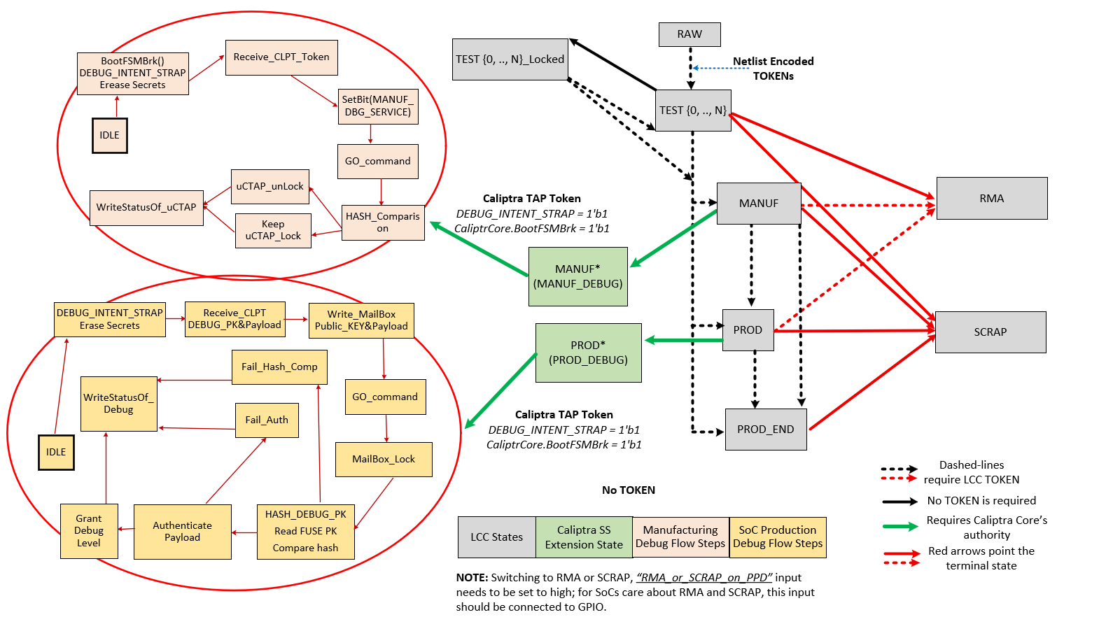 As an extension to controlling configuration, the Silicon RoT must control the security states (for more information, see Caliptra Security States). Certain security states by design grant full invasive capabilities to an external operator, for debug or field analysis.